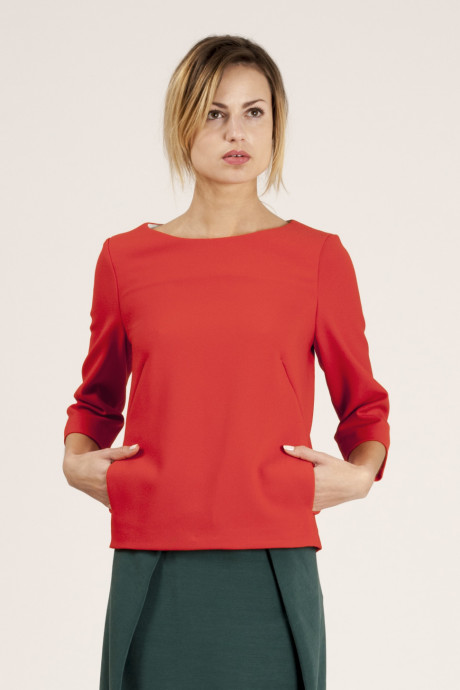 3/4 sleeved top in poppy red. Pockets in side seam. Also available in summery tartan. Material 95% viscose crepe. 5% elastane.