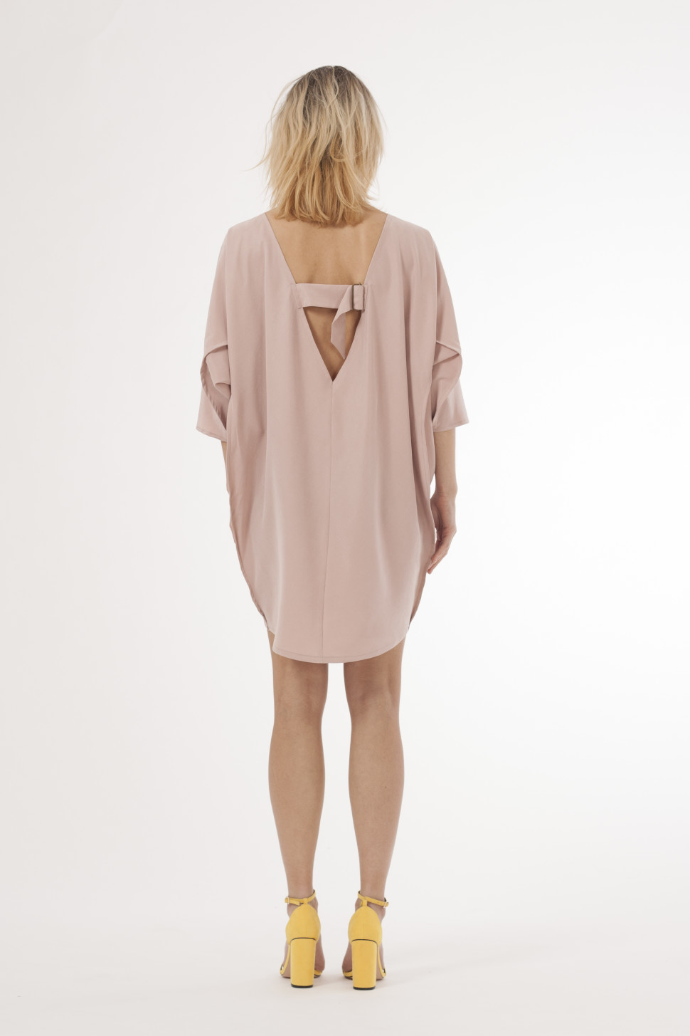 Loose fit dress with deep V-neck. The strap in the back covers your bra strap. Also available in dark blue and black.